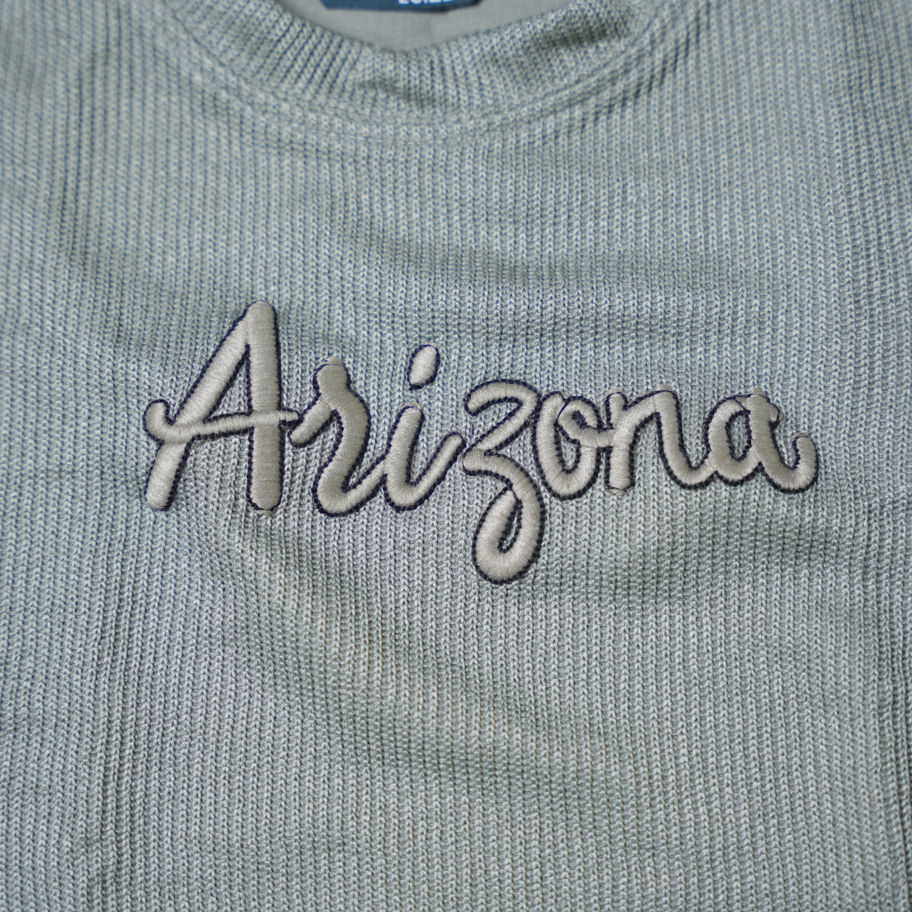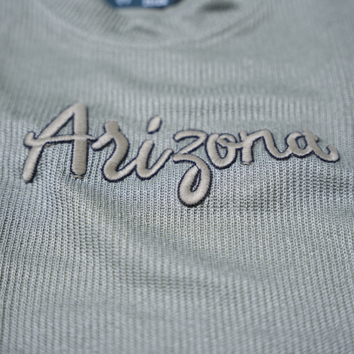 • Sage Green Textured t-shirt with white logo patch and ribbed detail.
