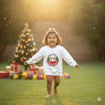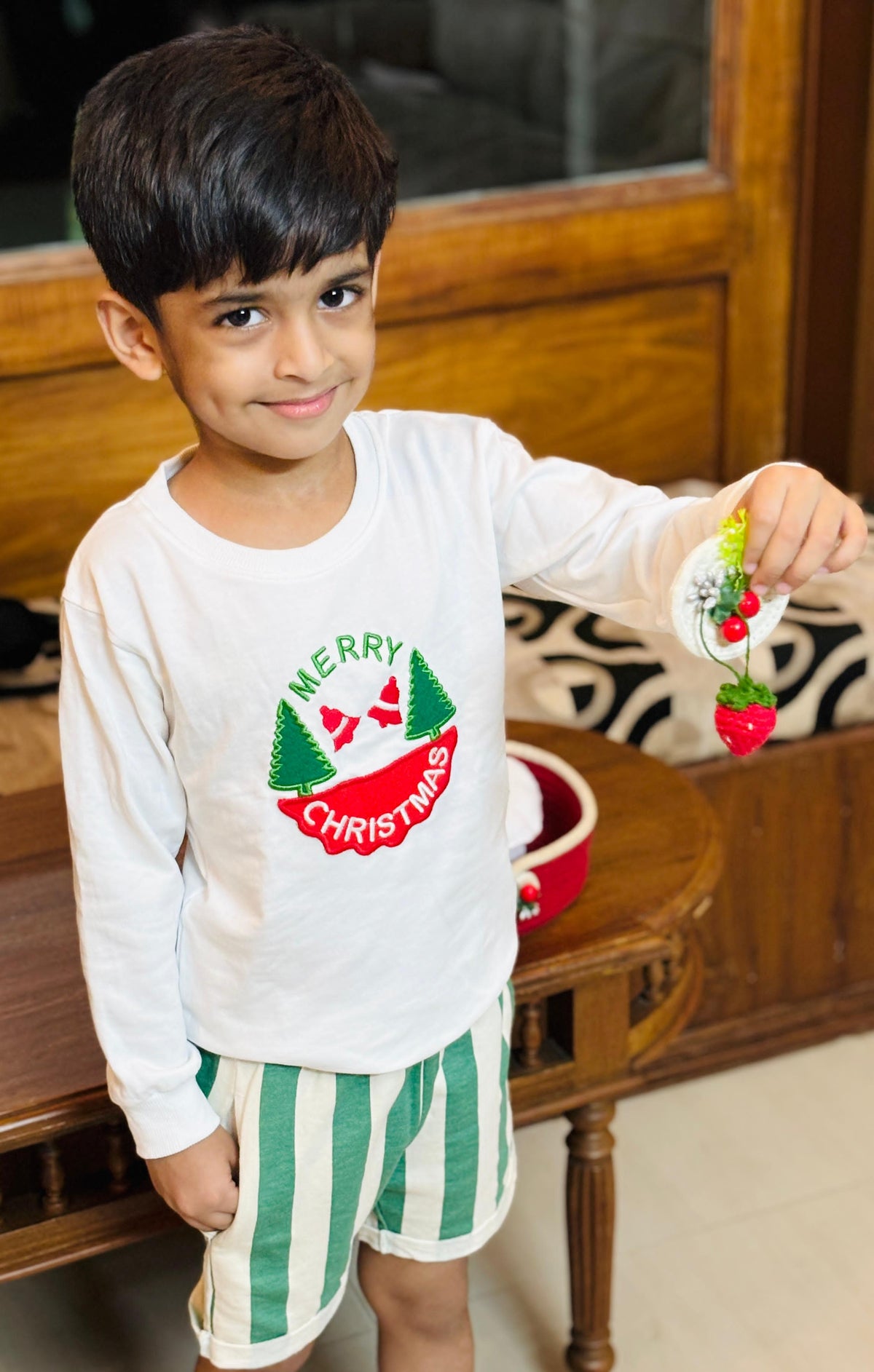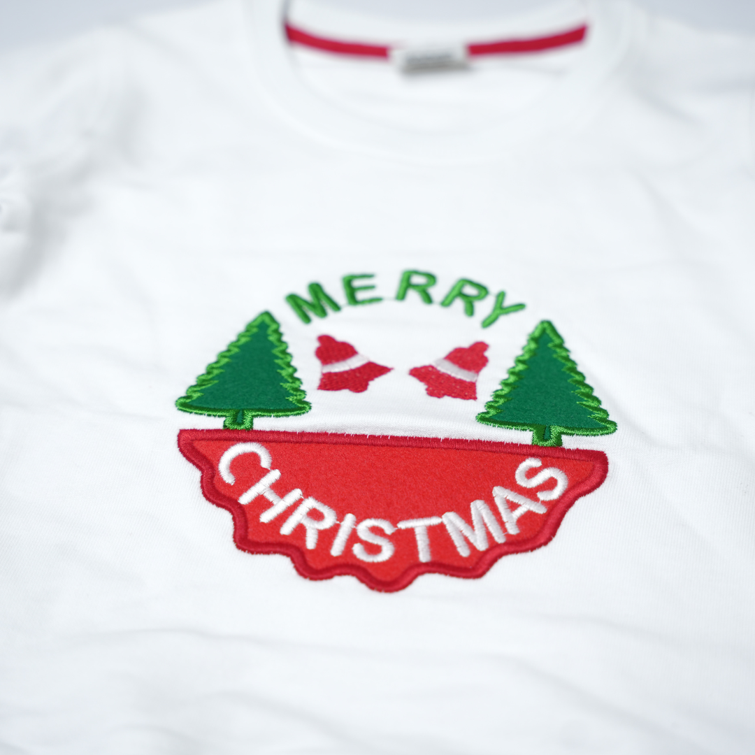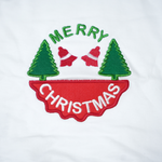 "Merry Christmas" print, pine trees and Santa hat details.