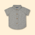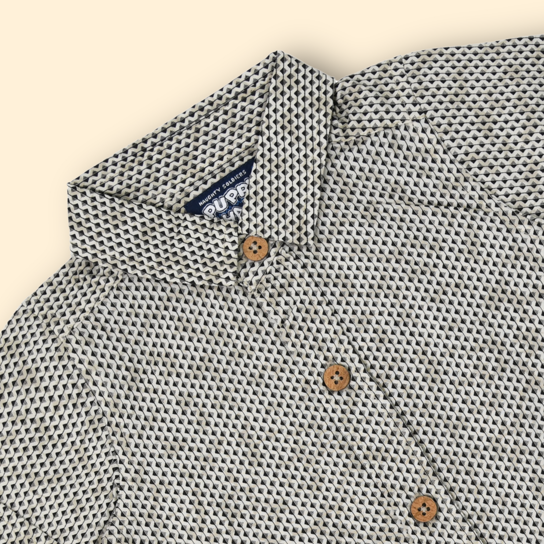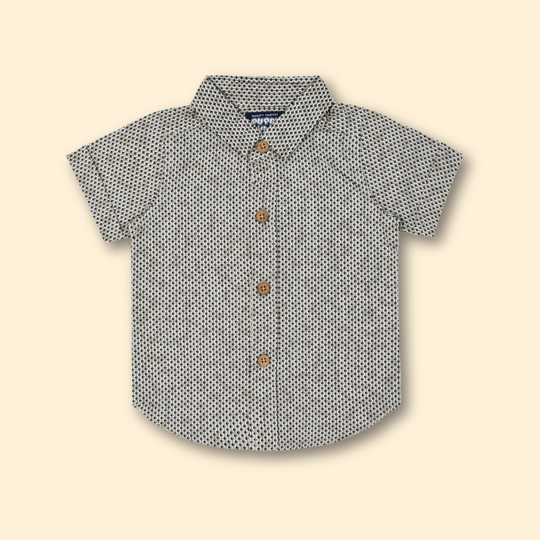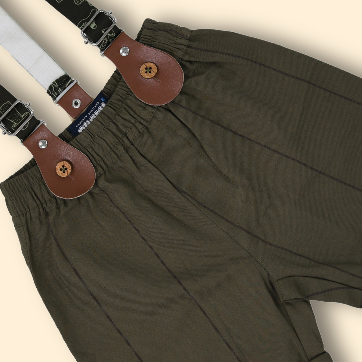 Classic geometric print shirt paired with olive green suspender shorts and wooden texture buttons.