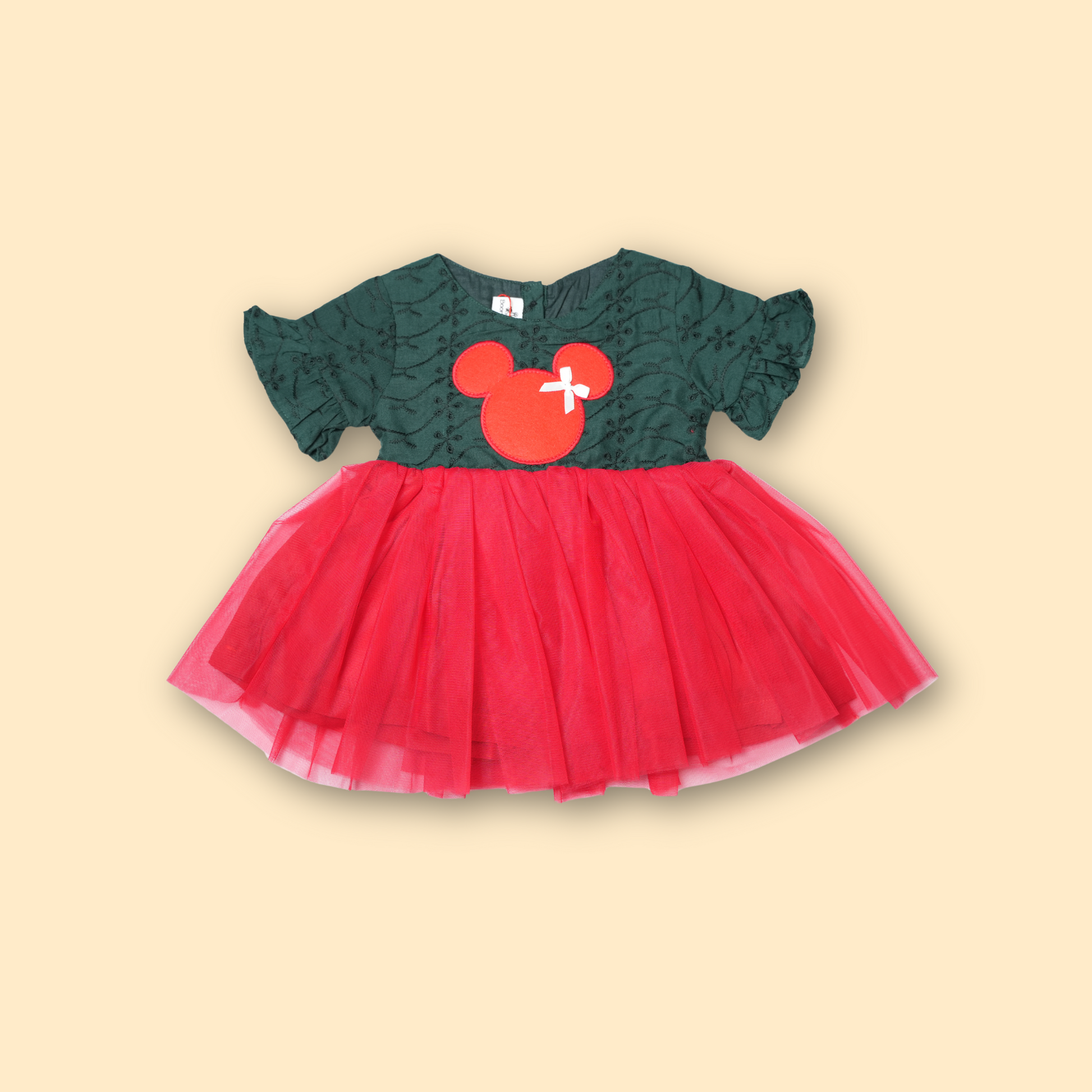 Festive Green and Red Mickey Mouse Schiffli Dress