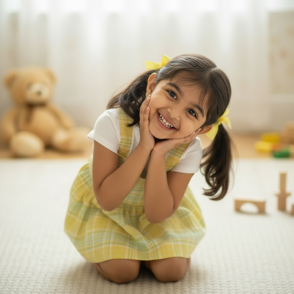 - Charming Pastel Plaid pinafore dress with White puff-sleeve top and Decorative buttons.