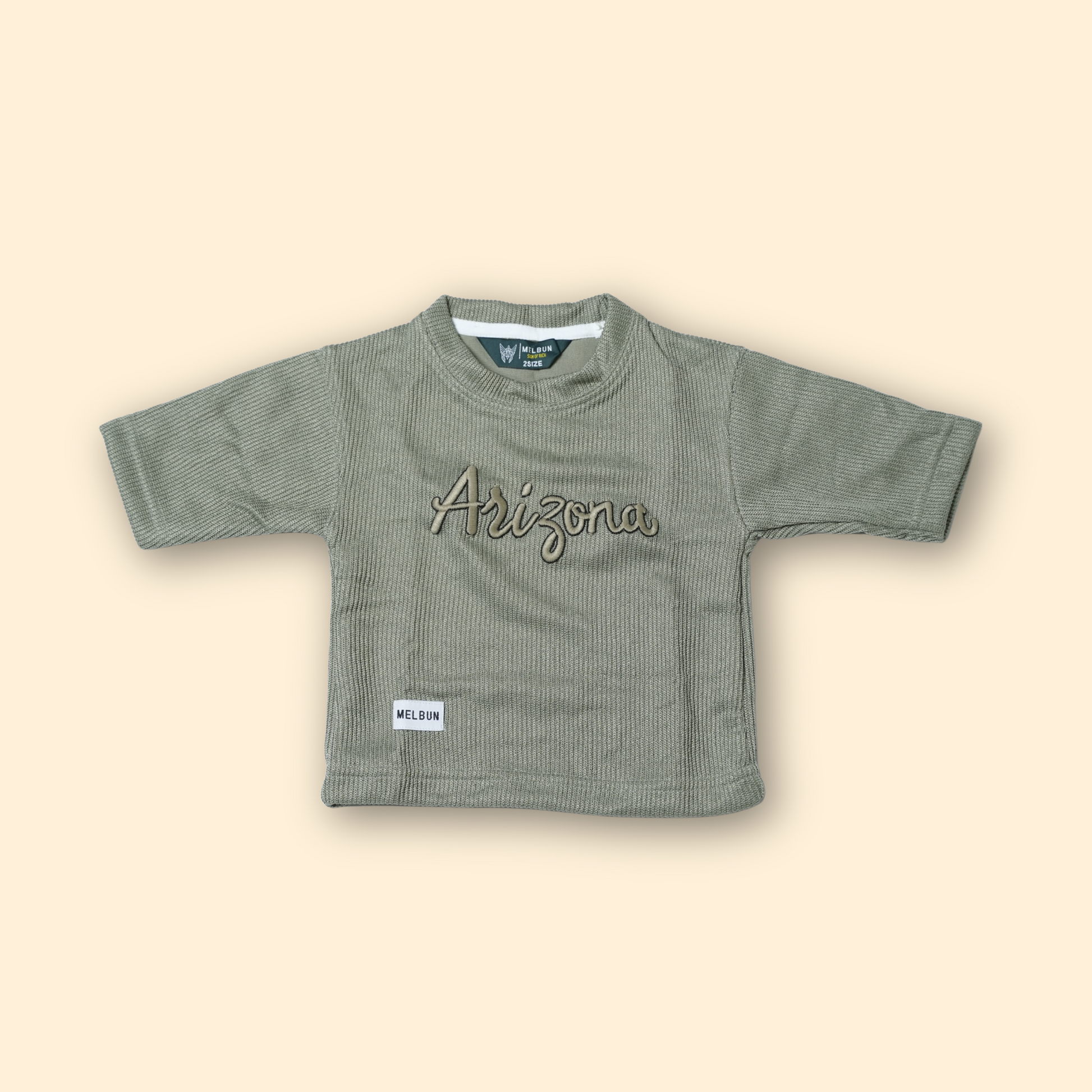 - Sage Green Textured t-shirt with white logo patch and ribbed detail.