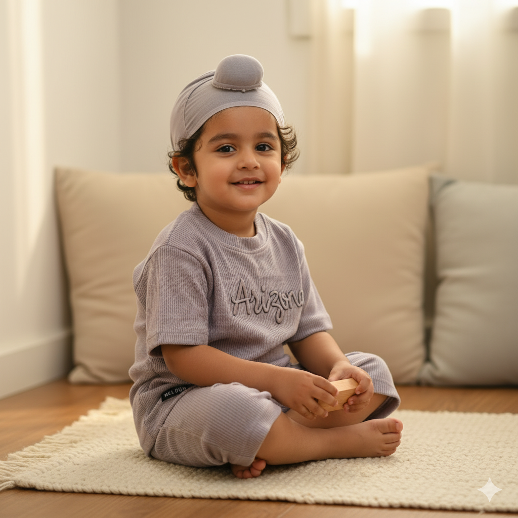 - Rich Grey Textured t-shirt with white logo patch and ribbed detail.