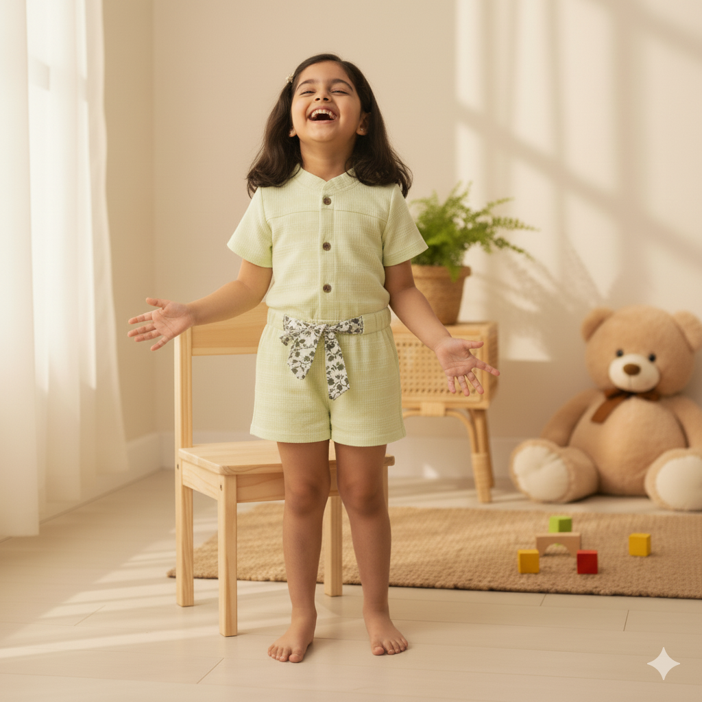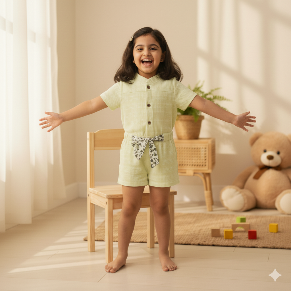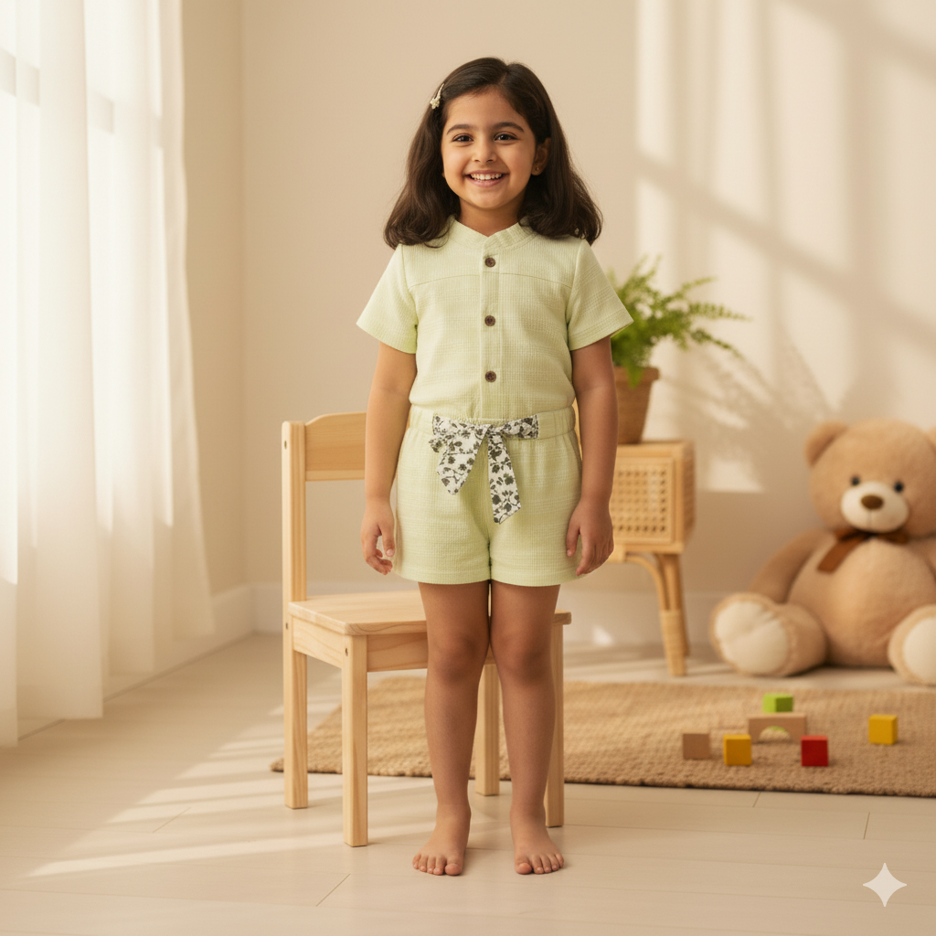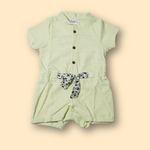 Sweet Lime Green Textured Rompers with Floral Print Belt